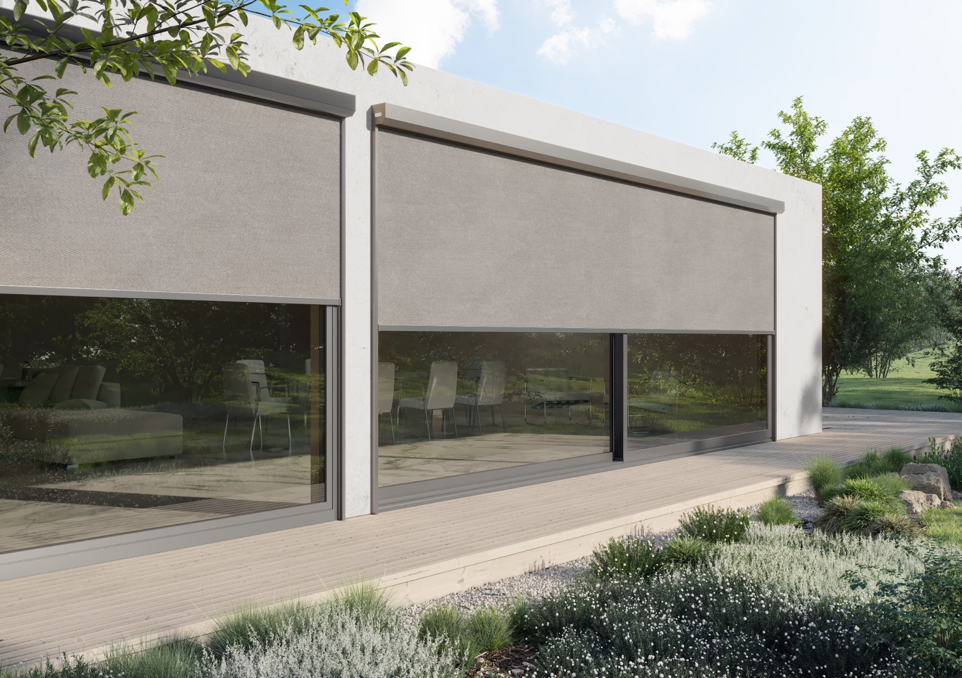 Náš nejnovější produkt spojuje moderní technologie a špičkové materiály. Skvěle se hodí nejen pro stínění oken rodinných domů, ale také teras, zimních zahrad či pergol. Jejich konstrukce je odlišná od ostatních typů stínění – nejsou tvořeny lamelami, ale speciální tkaninou ze skelných vláken, která je potažena PVC nebo polyesterovou textilií s PVC nánosem. Díky tomu jsou částečně světelně propustné, přesto však účinně pomáhají s úsporou energií i ochranou soukromí.